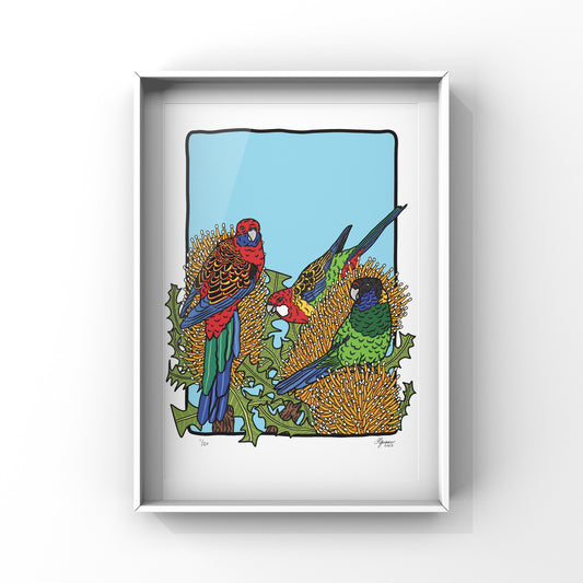 Eastern Rosella, Crimson Rosella & Australian Ringneck Art Print