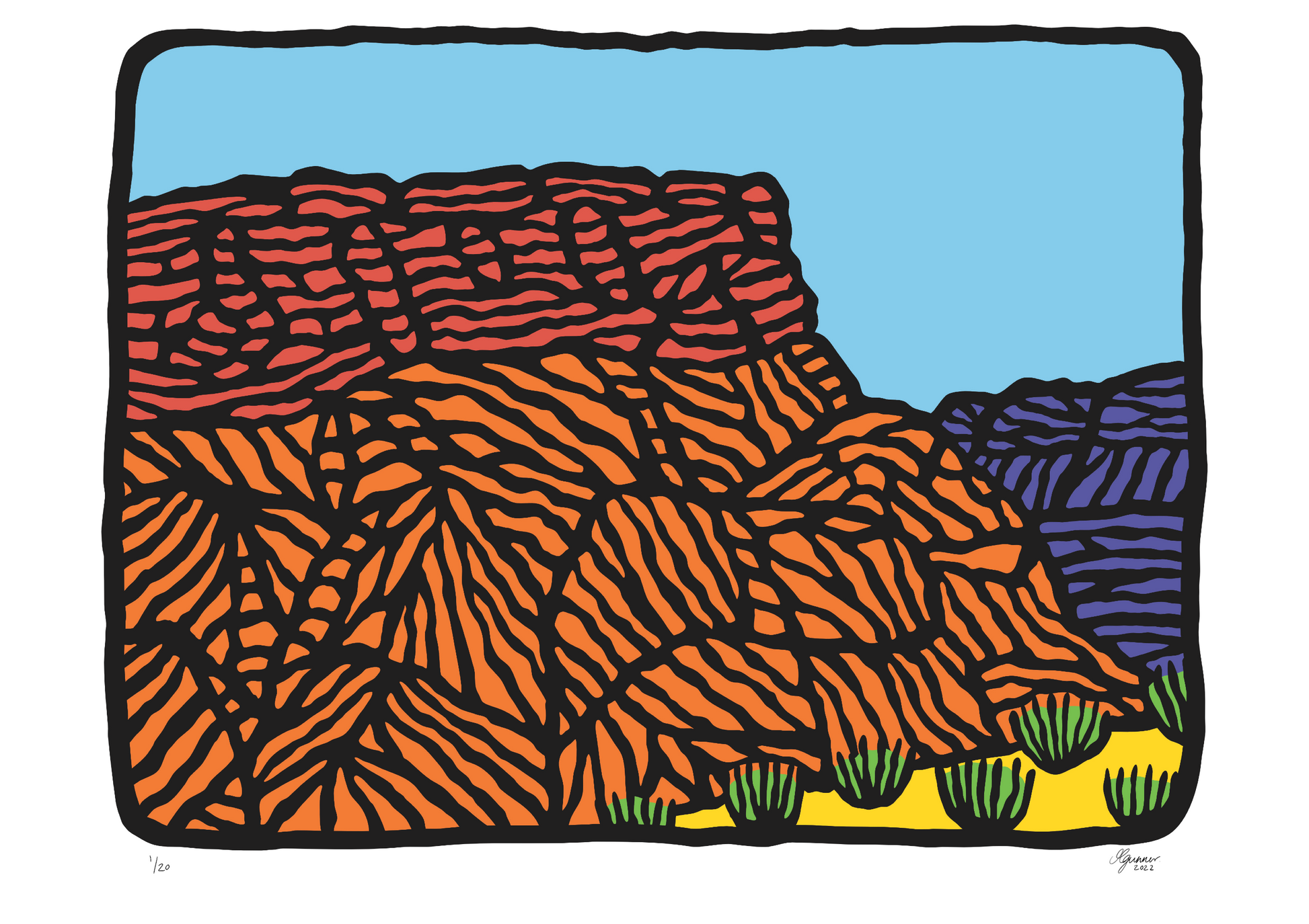 This particular print depicts the famous Mt Gillen Summit of the gorgeous MacDonnell Ranges and is based off a painting I had displayed at the Adelaide Mindshare Exhibition in 2022. It is the highted summit of the ranges closest to town and used to have the great Mt Gillen Walk and Climb that would start at John Flynn's Grave down Larapinta Drive. Although the walk is now closed in respect for Traditional Land Owners, the summit is still a staple of Alice Springs and is appreciated by many, especially at sunset when its silhouette glows against the setting sun. 🌞❤️